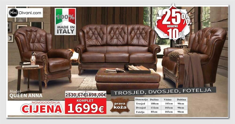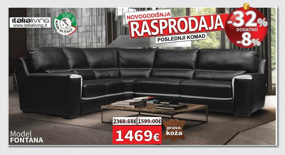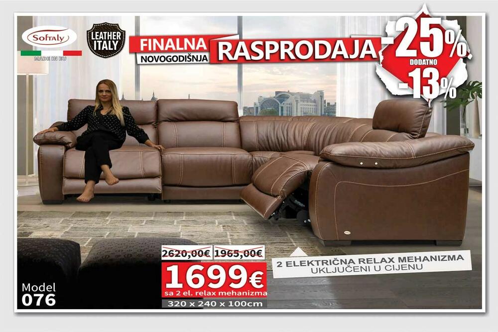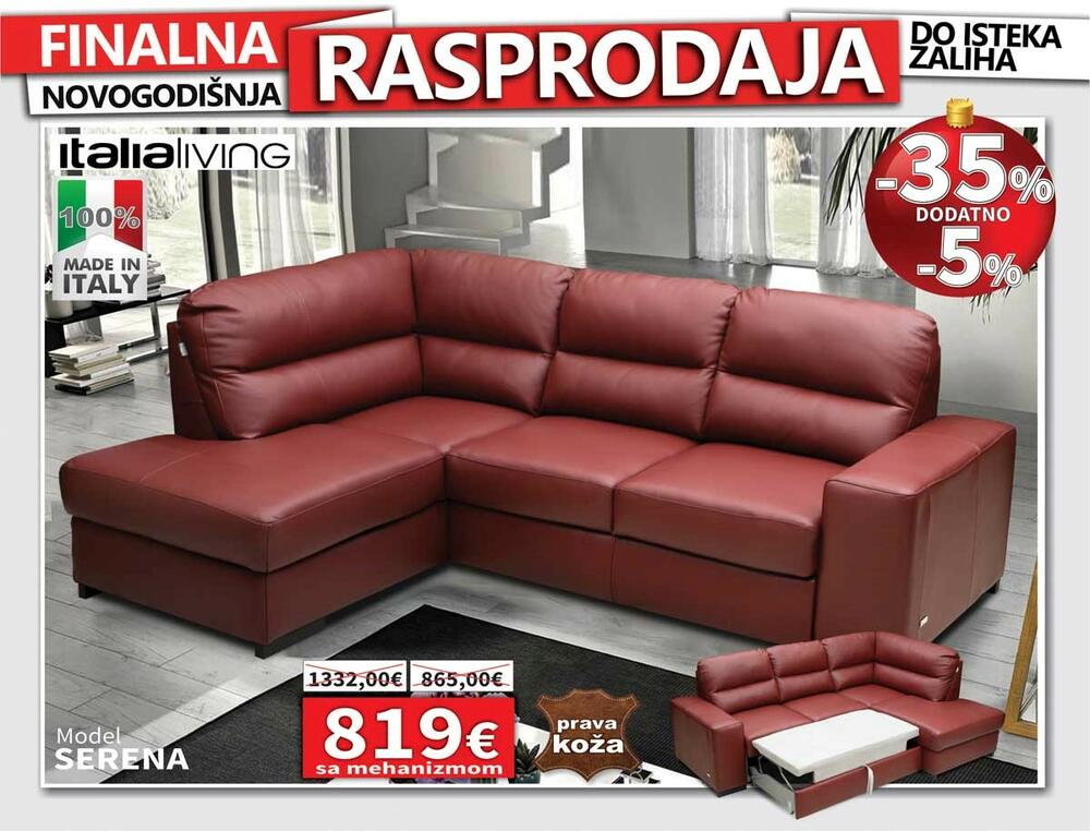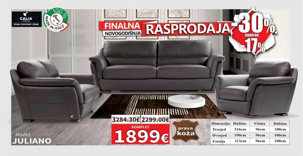 Pored Matis kuhinja po mjeri, na NOVOGODIŠNJEM SNIŽENJU u ponudi NAMOSA su preko 80 modela kožnih garnitura u raznim bojama, opcijama kao i sa električnim relax mehanizmima, garniture u štofu, spavaće sobe, veliki izbor komadnog namještaja.