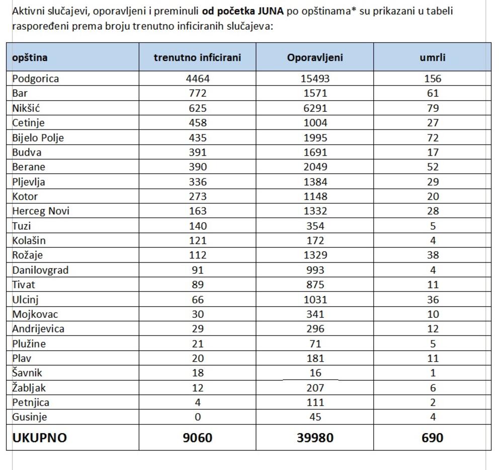 Uzimajući u obzir sve novootkrivene slučajeve kao i broj oporavljenih ukupan broj trenutno aktivnih slučajeva COVID19 u Crnoj Gori iznosi 9.060.