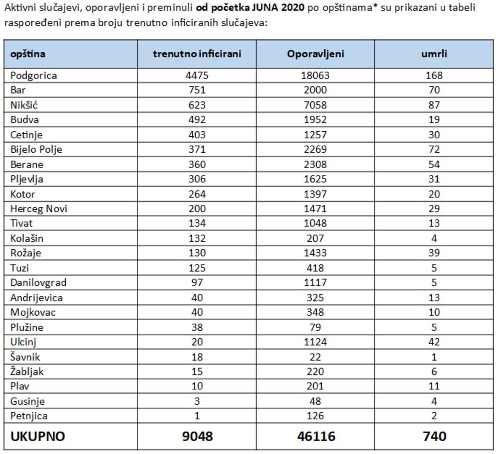 Najviše novih slučajeva, njih 174, registrovano je u Podgorici. Slijede Nikšić (51), Budva (34), Kotor (28), Berane i Cetinje (17), Bar (16), Tivat (15), Pljevlja (14), Bijelo Polje (12), Danilovgrad (11), Rožaje i Herceg Novi (9), Andrijevica (5), Kolašin i Plužine (3), Tuzi, Mojkovac i Plav (2) i Šavnik (1).