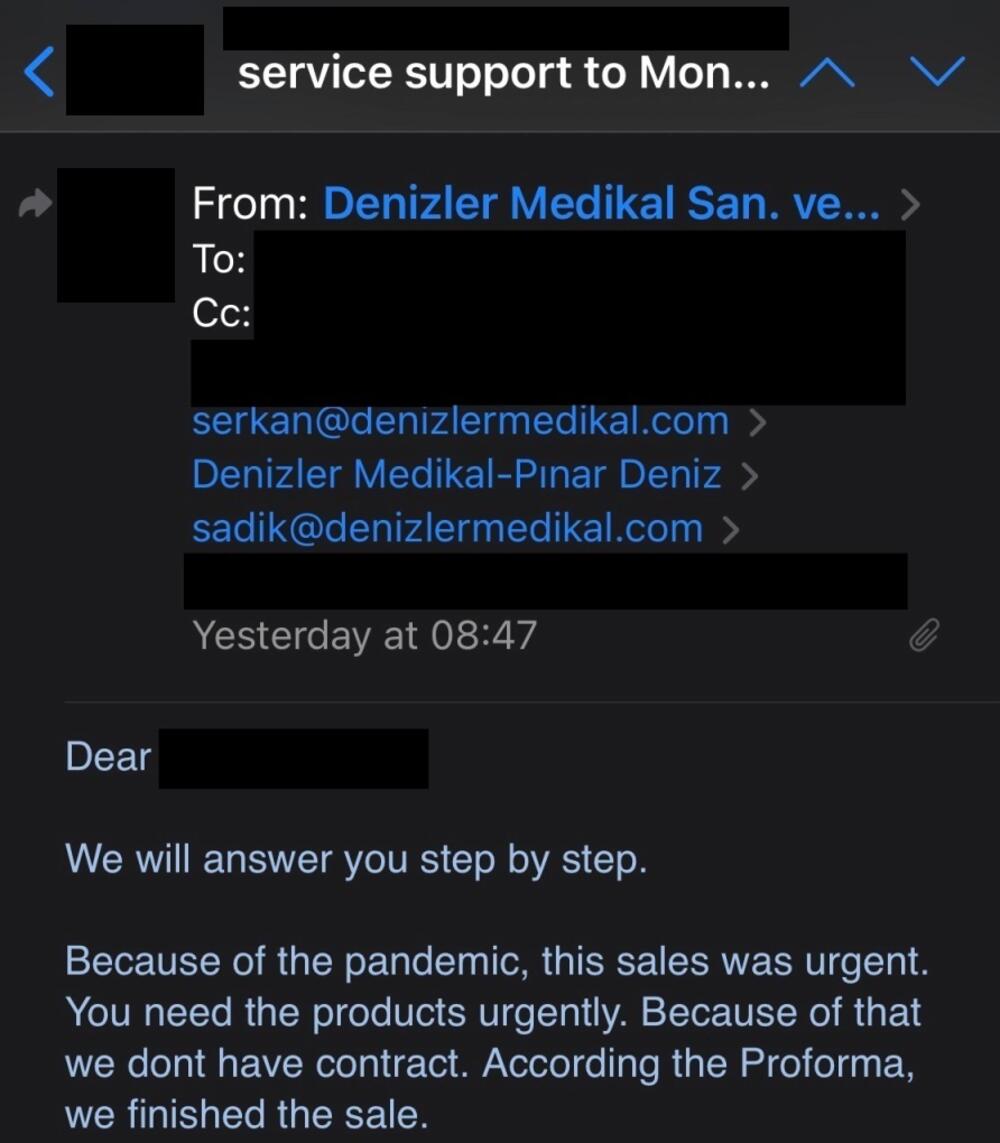 "Nabavka je bila hitna zbog pandemije. Proizvodi su vam hitno trebali. Zbog toga nemamo ugovor. Sudeći na osnovu predračuna, prodaju smo završili", odgovorila je turska firma.