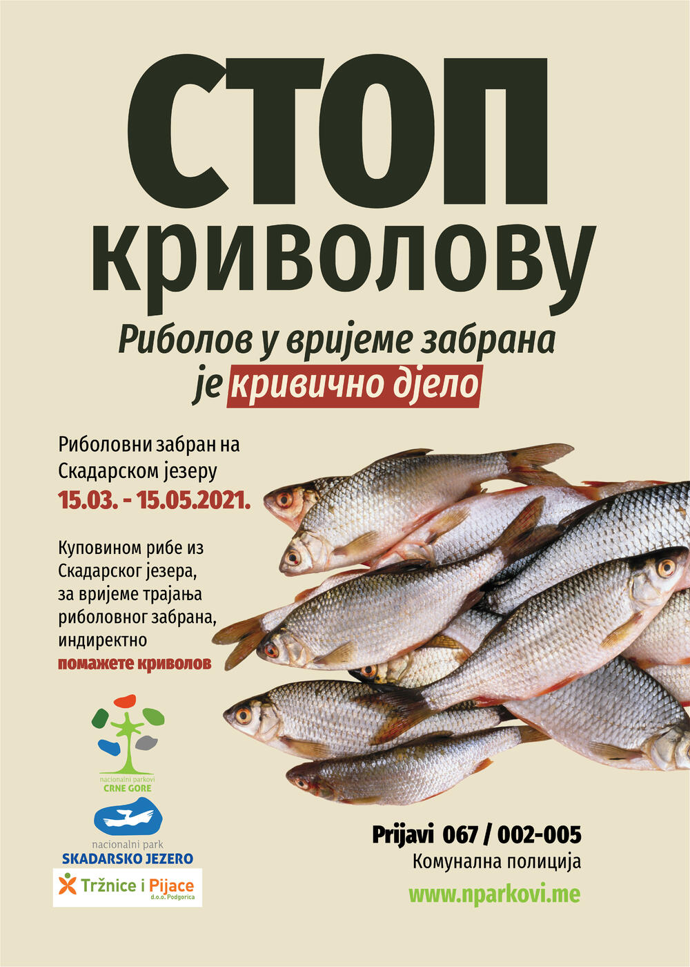 "Od 15. marta do 15. maja u Nacionalnom parku Skadarsko jezero na snazi je ribolovni zabran, koji se odnosi na ulov svih vrsta riba i drugih vodenih organizama, osim jegulje. Početak ovogodišnjeg zabrana bio je razlog da, i ove godine, Javno preduzeće za nacionalne parkove Crne Gore pokrene kampanju "Stop krivolovu". Cilj kampanje je zaštita ribljeg fonda upravo u vrijeme kada se riba mrijesti i kada je najranjivija, kako bi se njena populacija obnovila", ističe se u saopštenju JPNPCG.