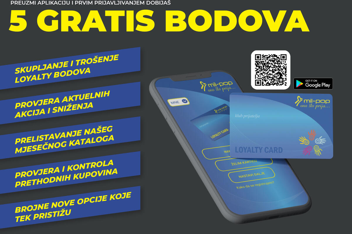 - Skupljanje i trošenje loyalty bodova, koji se mogu koristiti pri kupovini SVIH artikala u Mil Pop radnjama širom Crne Gore
