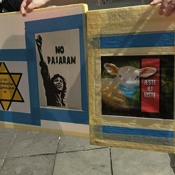Okupljeni nose majice sa natpisom "Reci ne maskama, stop kovid fašizmu", kao i transparente "No passaran", "Stop prisilnoj vakcinaciji", "Ne želim vakcinu", "Ne damo vam našu djecu"...