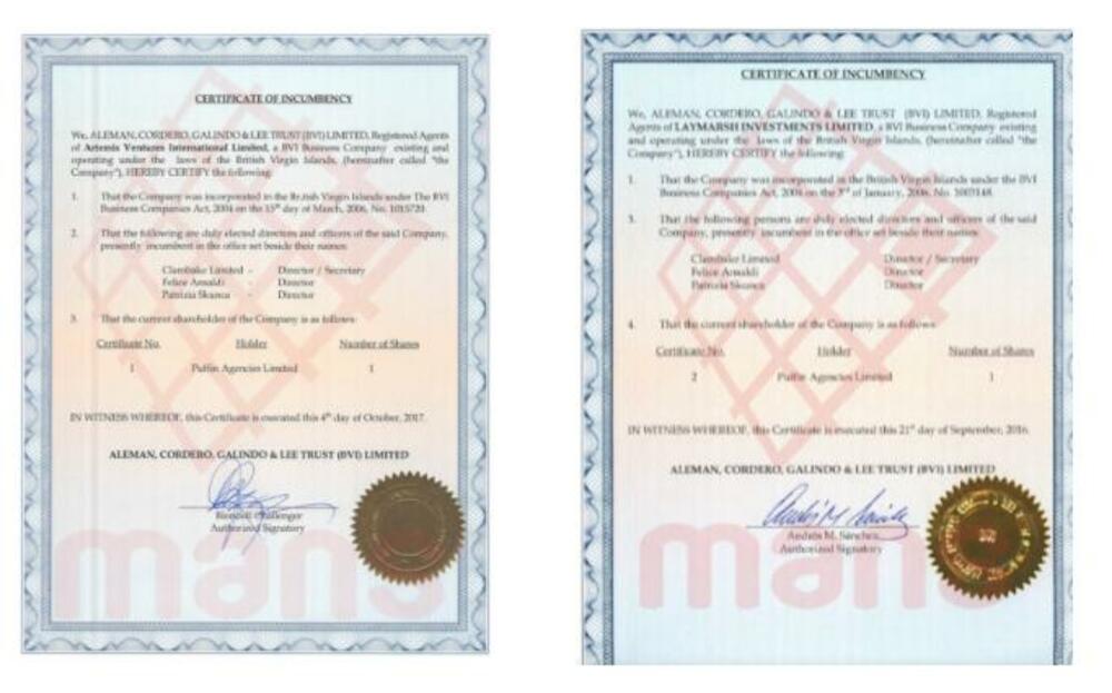 U internom dokumentu advokatske kuće ALCOGAL se navodi da je Perše pravi vlasnik Artemisa.