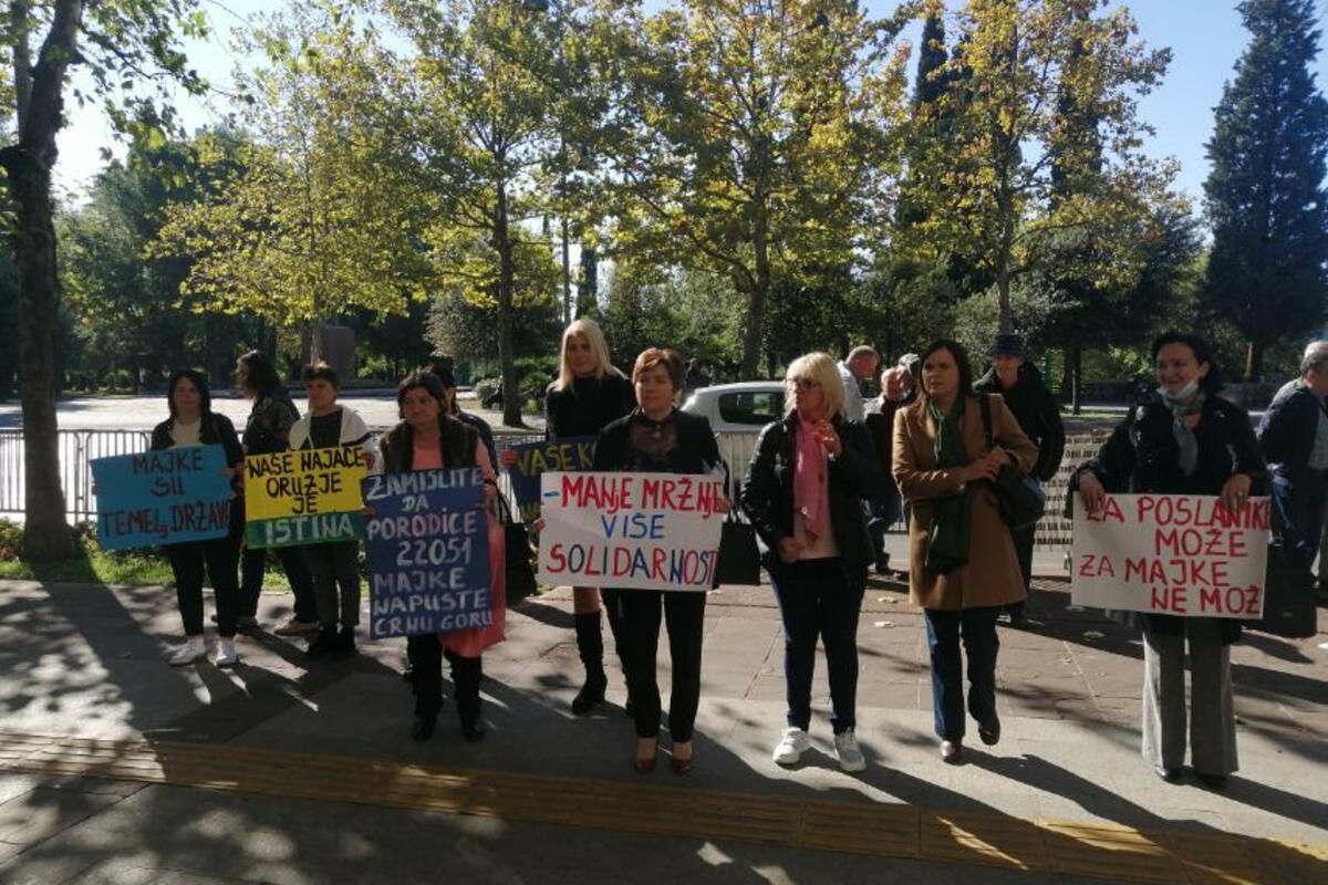 Okupljene majke nose transparente na kojima su ispisane poruke - "Za poslanike može, za majke ne može", "Manje mržnje, više solidarnosti", "Vaše koverte su naše naknade, plate, penzije", "Zamislite da porodice 22.051 majke napuste Crnu Goru", "Naše najjače oružje je istina", "Majke su temelj države", "Ne damo im da na vas bace inje, gledate ih ponosno sa visine"...