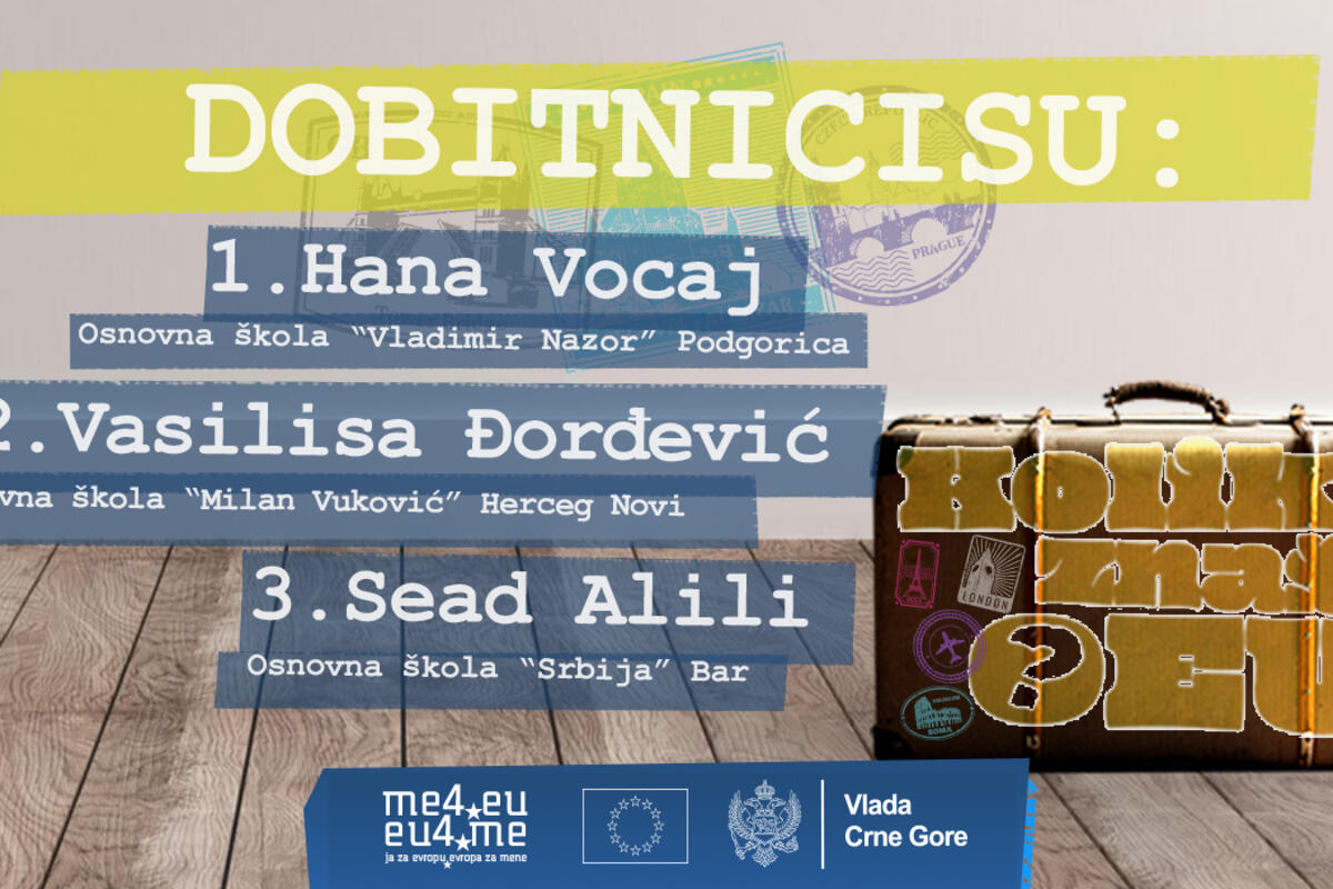 Hana Vocaj, učenica Osnovne škole „Vladimir Nazor“ iz Podgorice, Vasilisa Đorđević, učenica Osnovne škole „Milan Vuković" iz Herceg Novog i Sead Alili, učenik Osnovne škole „Srbija" iz Bara, pobjednici su onlajn kviza „Koliko znaš o EU?“.