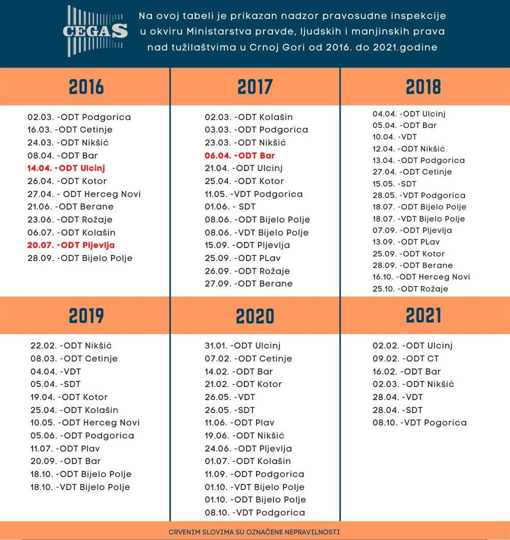 Pored toga, isti pravosudni inspektor Ministarstva pravde u istom je danu 2020. godine vršio nadzor nad dva najvažnija crnogorska tužilačka organa - Vrhovnim državnim tužilaštvom (VDT) i Specijalnim državnim tužilaštvom (SDT). Naredne, 2021. godine, opet je jedna osoba ispred Ministarstva pravde u jednom danu izvršila kontrolu oba ova tužilaštva. Nadzor je u 2020. godini urađen 26. maja, a prošle godine nadzor nad SDT-om i VDT-om obavljen je 28. aprila.