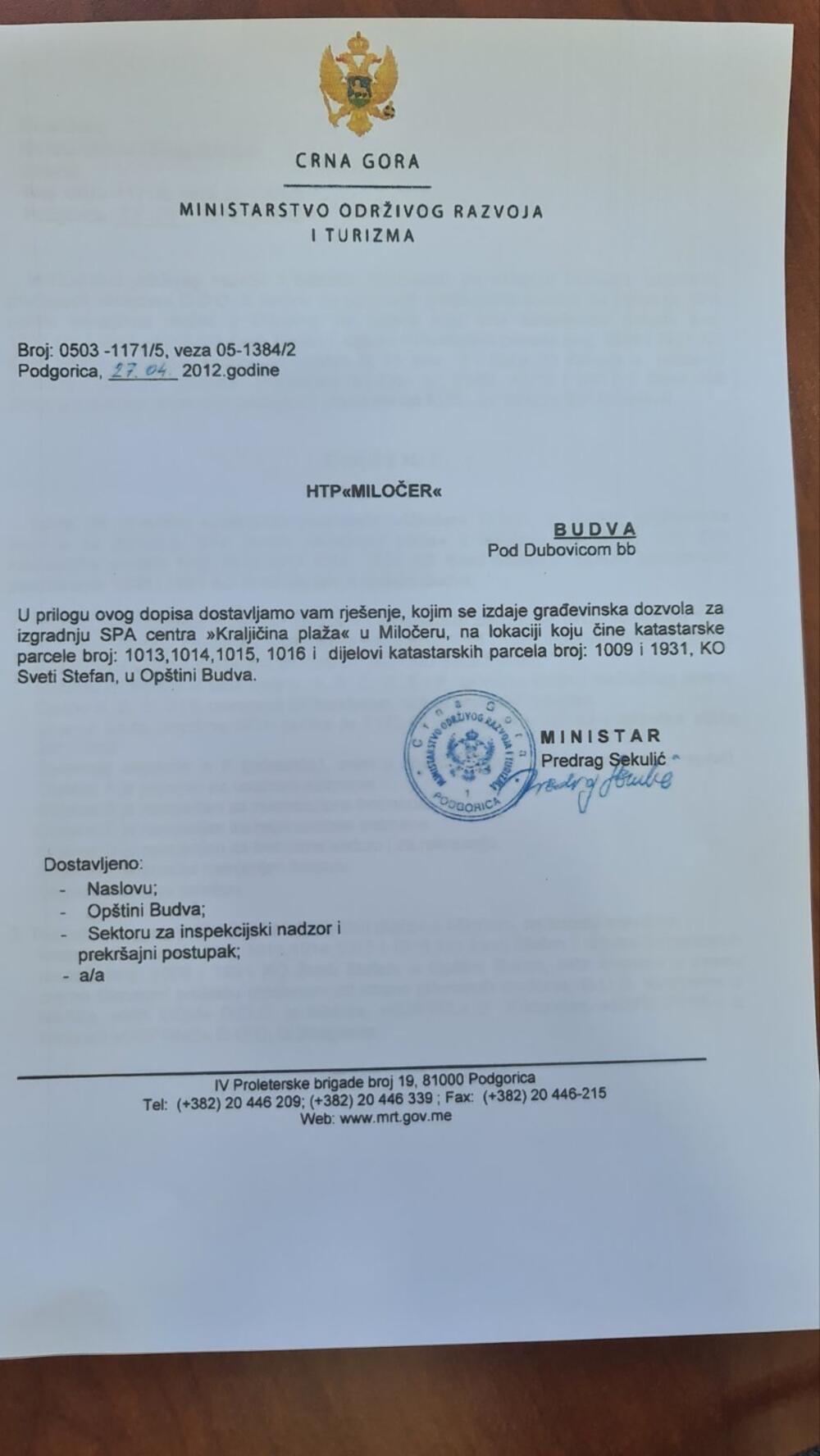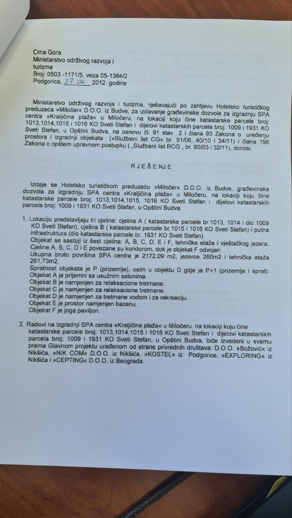“Iz građevinske dozvole za SPA centar Kraljičina plaža jasno se vidi da kapija nije predviđena i samim tim sve vrijeme nas investitor odnosno zakupac obmanjuje da im je dozvoljeno postavljanje kapije. Jasno i nedvosmisleno se da zaključiti da kapija postoji kao evidencija stanja zatečenog na terenu u trenutku izrade građevinske dozvole, ali ne u građevinskoj dozvoli koja je izdata od tadašnjeg Ministarstva održivog razvoja i urbanizma Broj: 0503-1171/5, veza 05-1384/2 od 27.04.2012.godine koju potpisuje tadašnji ministar Predrag Sekulić”, naglasio je Rađenović.