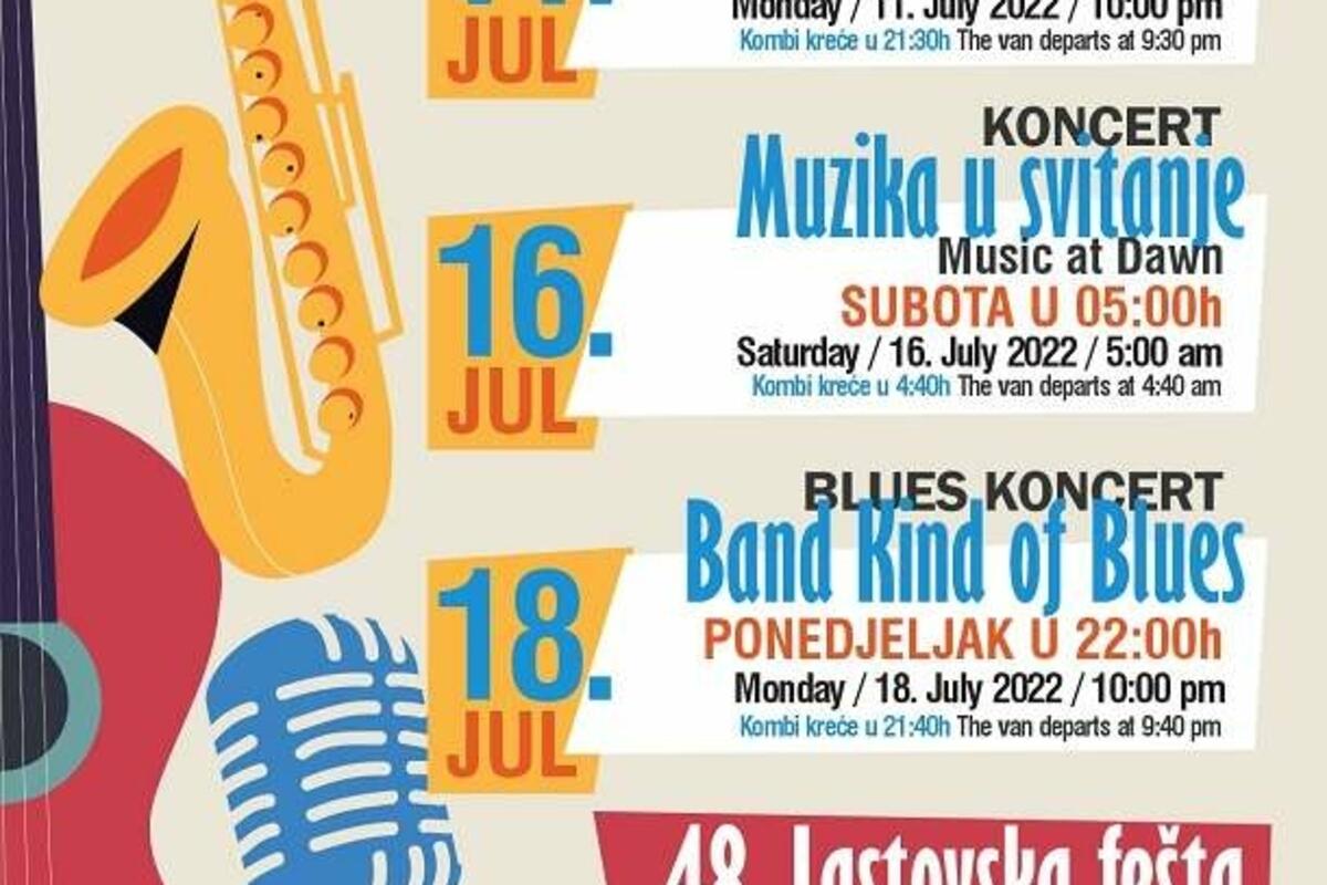 Sljedeći koncert je “Muzika u svitanje”, u subotu 16. jula sa početkom u 5 sati ujutro, a bluz koncert Band Kind of Blues je u ponedeljak, 18. jula u 22 sata.