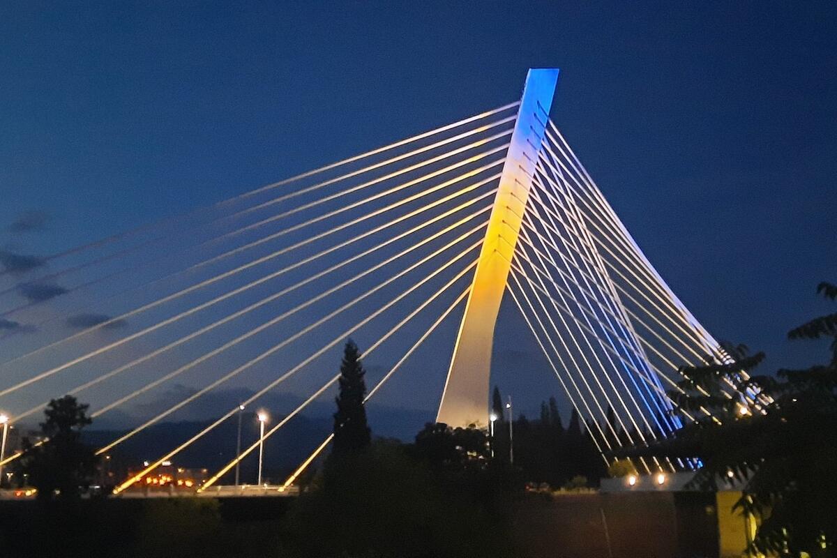 Podgorički most Milenijum večeras je, povodom Dana nezavisnosti Ukrajine, osvijetljen u bojama zastave te zemlje.