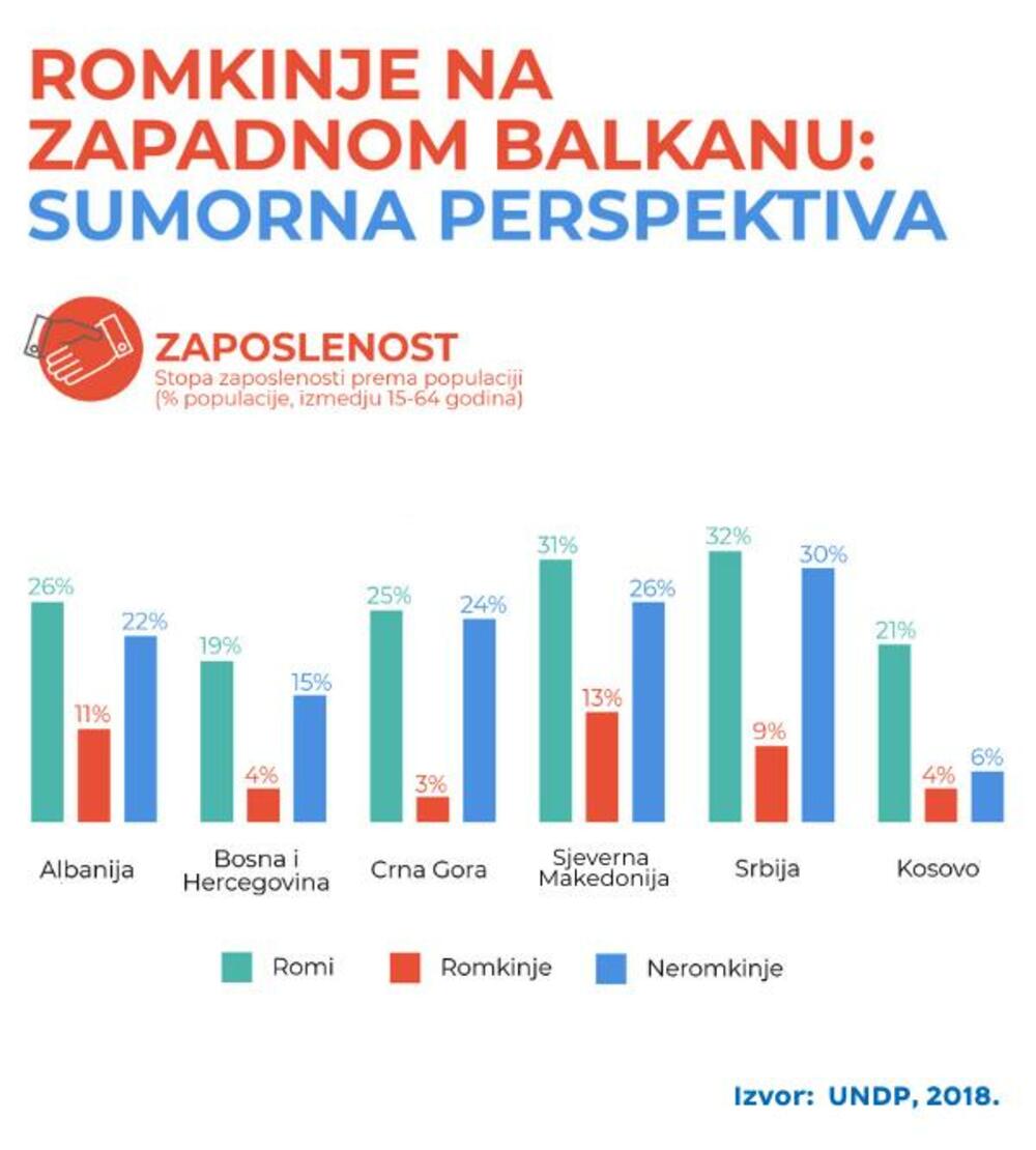 Izvještaj UNDP-a iz 2018. godine o zapošljavanju pripadnika ove zajednice u regionu pokazuje da Romkinje u Crnoj Gori imaju pet puta nižu stopu zapošljavanja od Roma, a oko osam puta nižu od žena koje nisu Romkinje, a nalaze u neposrednoj blizini.