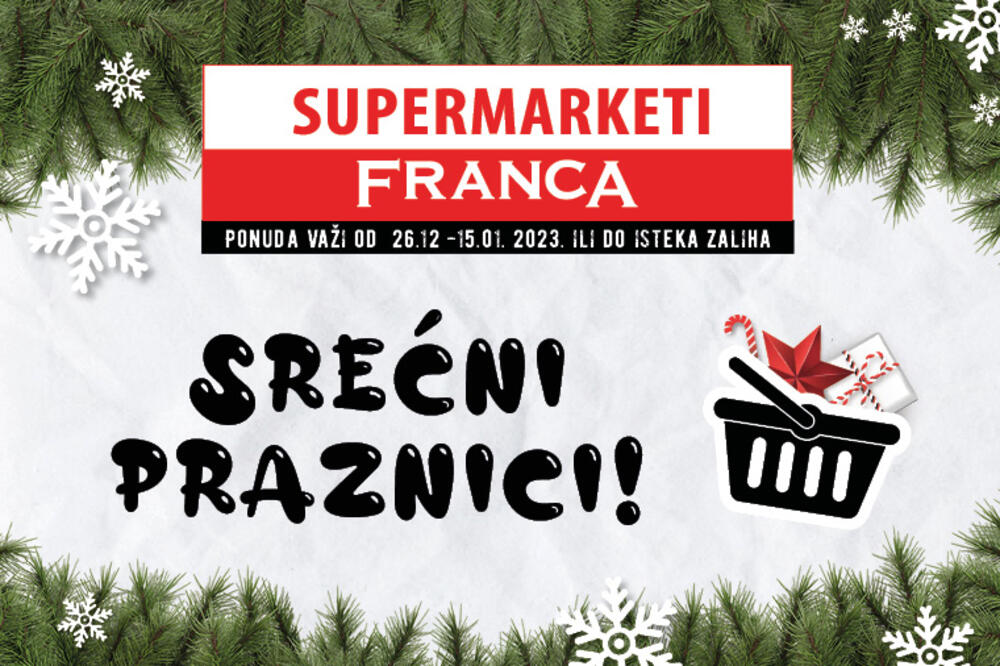 Posjetite obližnji supermarket Franca i uživajte u našoj prazničnoj ponudi od 26.12 do 15.01.2023.godine.