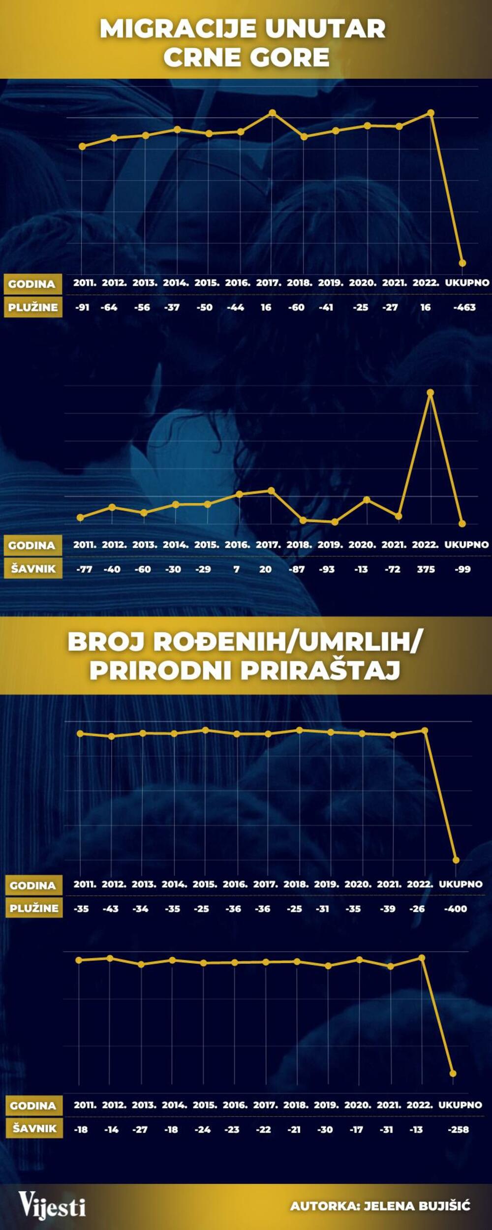 Pošto ne postoje podaci za migracije van Crne Gore, već samo unutar države, u Plužinama je od posljednjeg popisa do novembra prošle godine doseljeno 318 stanovnika, a odseljeno više nego duplo - 781, pa je i kod ovog demografskog podatka saldo negativan, -463. U šavničkoj opštini ovaj podatak ne odslikava pravo stanje stvari, jer ako se zna da se u tu poddurmitorsku opštinu za deset godina (od 2011. do 2021) doselilo ukupno 328 stanovnika, što je za 108 manje nego za deset mjeseci prošle godine, koja je izborna (mada je i ova izborna, pošto glasanje u toj opštini još uvijek nije završeno), jasno je da Šavnik nije preko noći postao primaljiv pa su zbog toga, a ne zbog izbora, stanovnici iz drugih opština u Crnoj Gori, pohrlili u opštinu sa najmanjim brojem stanovnika (prema popisu iz 2011).