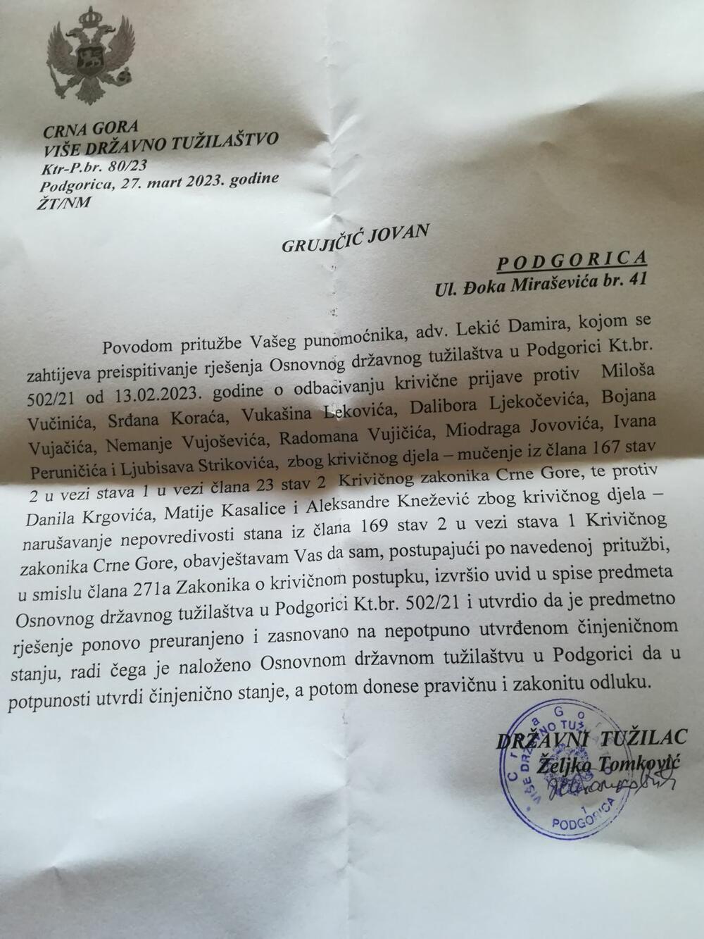 "Viši državni tužilac Željko Tomković je ocijenio da je i treće rješenje državne tužiteljke Maje Knežević iz ODT (Osnovno državno tužilaštvo) Podgorica da odbaci krivičnu prijavu protiv 10 službenika Centra bezbjednosti (CB) Podgorica koji su osumnjičeni za mučenje Jovana Grujičića u istrazi "bombaških napada" preuranjeno i zasnovano na nepotpuno utvrđenom činjeničnom stanju", ističe se u saopštenju HRA