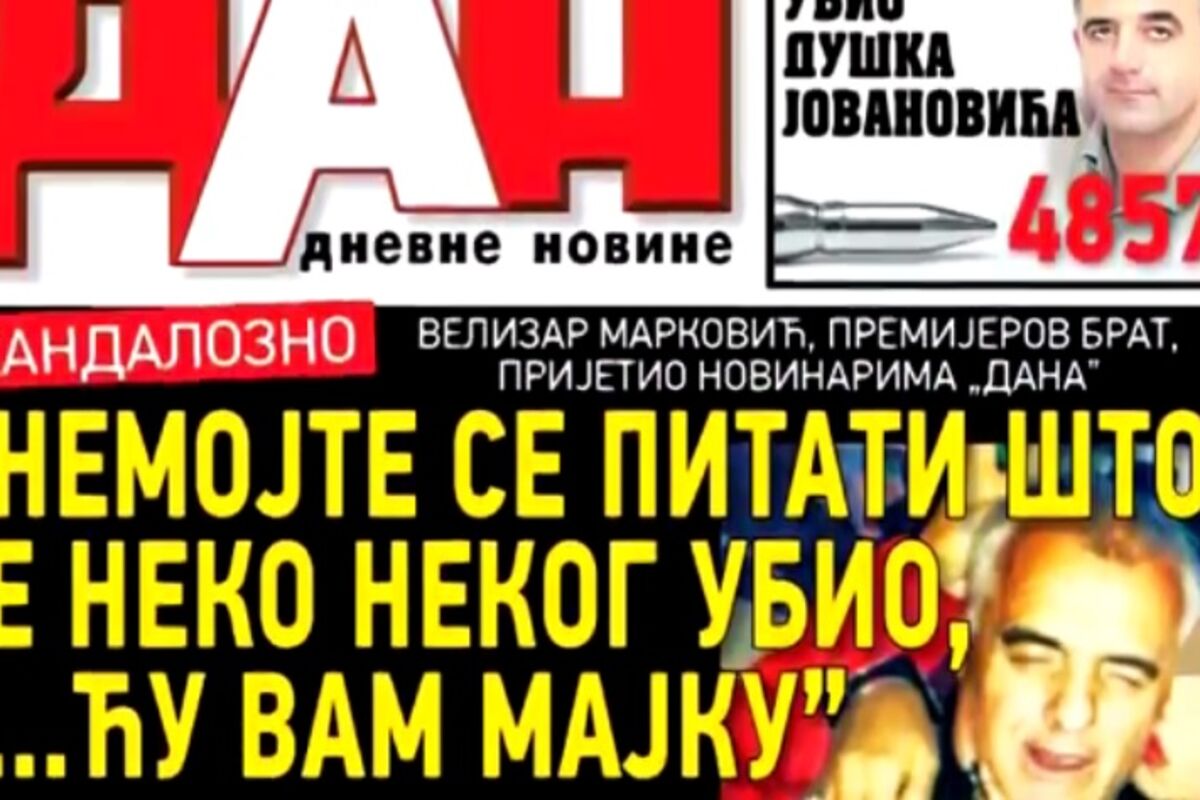 Regionalna platforma Zapadnog Balkana za zagovaranje medijskih sloboda i bezbjednost novinara, koja zastupa više od 7.800 članova, osuđuje prijetnje smrću koje je brat predsednika Vlade Crne Gore Duška Markovića, Velizar Marković, uputio novinaru dnevnog lista "Dan" Vladimiru Otaševiću, saopšteno je danas iz te organizacije.