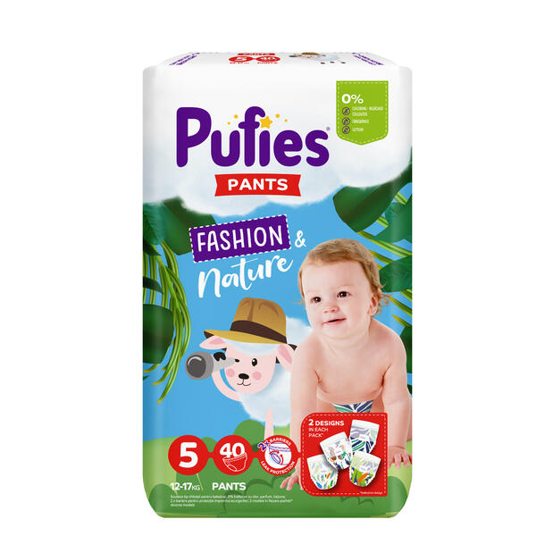 Pufies Fashion&Nature su napravljene od materijala visokog kvaliteta i bezbednosti. Imaju inovativne ureze/kanale/ koji apsorbuju 3 puta brže i pružaju do 12 sati zaštitu od curenja *. Takođe sa osiguranim dvostrukim barijerama koje štite od bočnog curenja. Sa novim Pufies Fashion&Nature pelenama i gaćicama možete se osloniti na sigurnost, kvalitet i slobodu kretanja za svoju bebu.