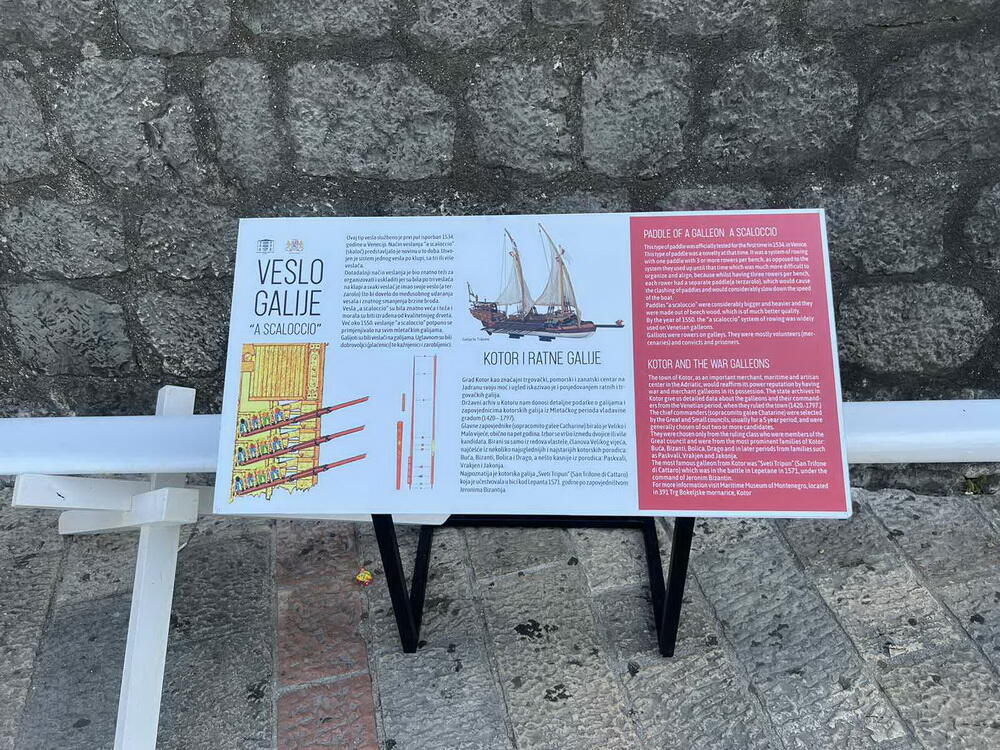 “Postavljanjem vesla galije Kotor dobija novu turističku atrakciju i prisjećanje na važni dio pomorske istorije grada koji do sada nije bio dovoljno ispričan. Repliku vesla prati i edukativni dvojezični pano na kojem se nalazi kratka priča o kotorskim galijama i njihovim zapovjednicima, i na kojem je prikazan način veslanja na galijama iz 16. vijeka”, saopšteno je iz Pomorskog muzeja.