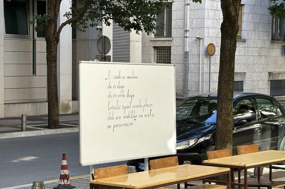 Članovi neformalne grupe studenata "Kamo Śutra?" na trotoaru ispred zgrade Vlade postavili su dvije školske klupe sa četiri stolice i transparentom na kojem su ispisani stihovi iz "Krvave bajke" Desanke Maksimović "I činilo se svakom, da će dugo, da će vrlo dugo, trčati ispod svoda plava, dok sve zadatke na svetu ne posvršava".
