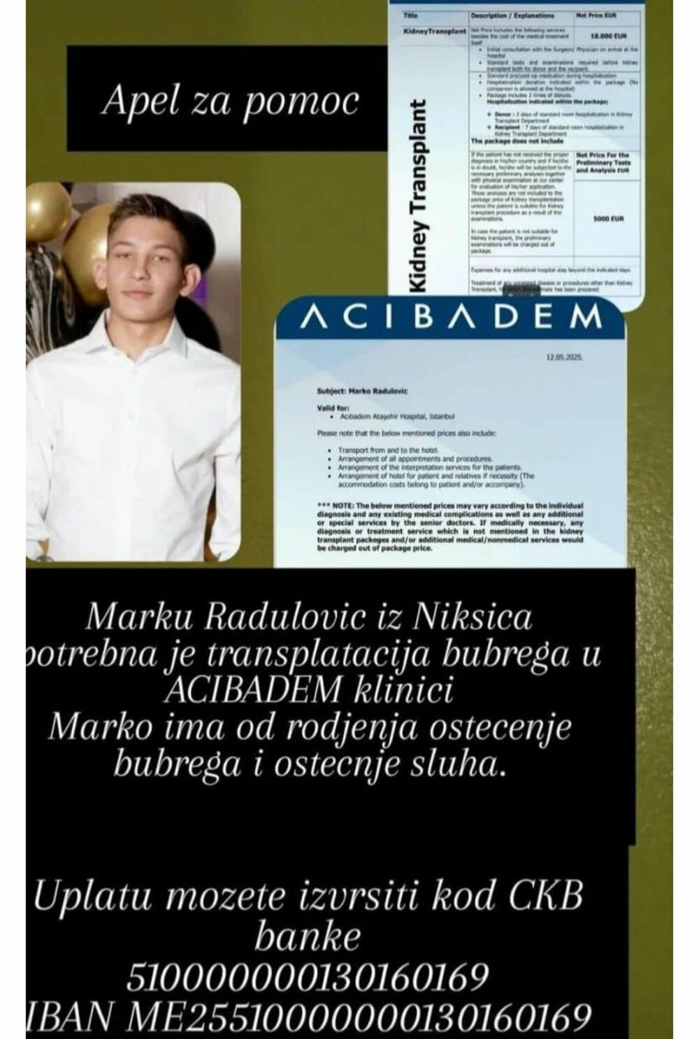 Radulovićima je potrebno minimum 30 hiljada eura. Svi koji žele i mogu da pomognu da Marku Raduloviću mogu izvršiti uplatu na njegovo ime na žiro račun kod CKB banke: 510000000130160169, IBAN ME 25510000000130160169.