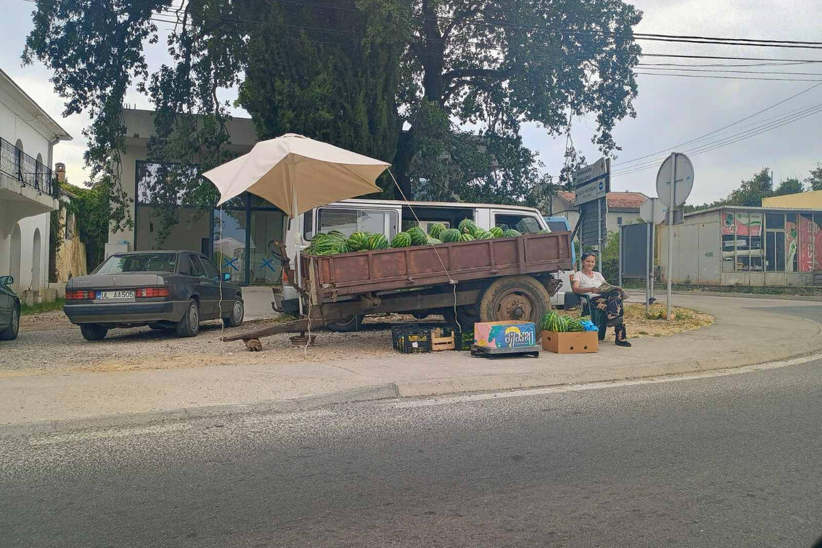 Nije pazarni dan pa nema ni prodavaca voća i povrća uz put, osim žene koja sjedi u hladovini pored traktorske prikolice do vrha pune lubenica iz tog kraja. Prazne su i tezge na pijaci, pored marketa “Idea”.