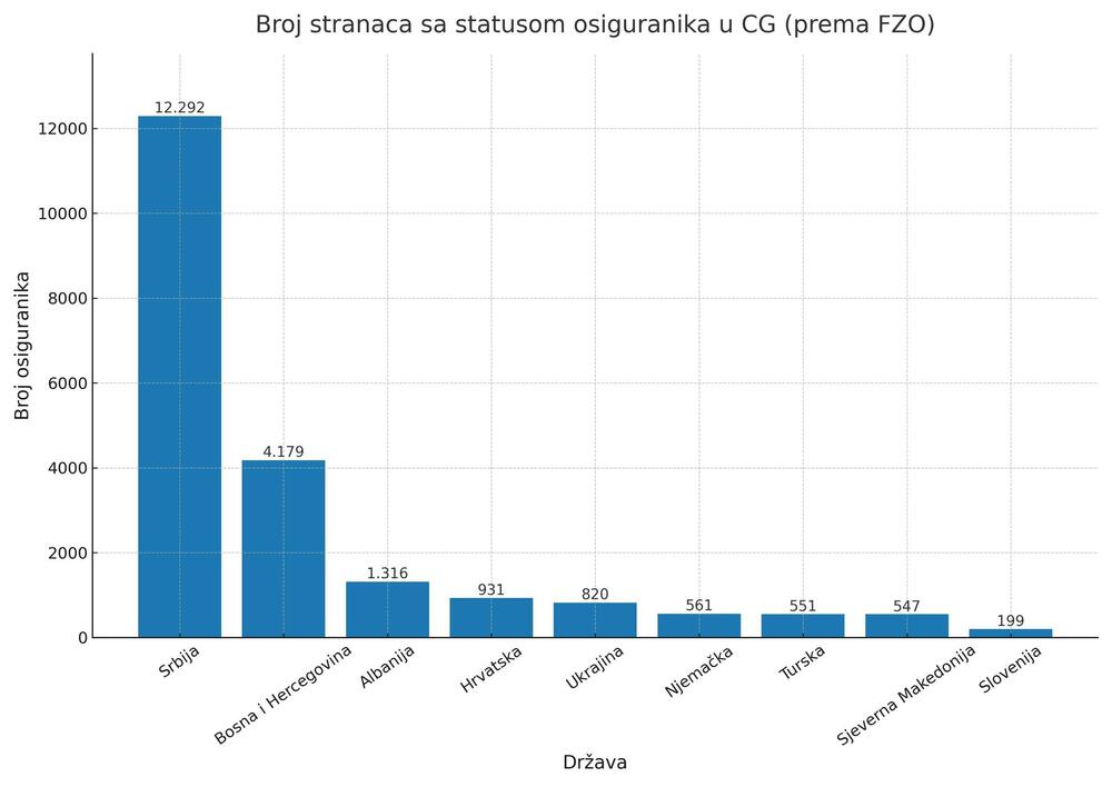 “U Crnoj Gori status osiguranika ima 33.290 stranaca s privremenim ili stalnim boravkom. Važno je napomenuti da se najveći dio navedene cifre odnosi na strance koji dolaze iz država s kojima imamo međunarodni sporazum kojim je definisan način sticanja statusa osiguranika u državi ugovornici. Takođe, s obzirom na to da je u pitanju na desetine država, ovom prilikom ćemo nabrojati 10 država s najvećim brojem osiguranika, a to su: Srbija (12.292), Bosna i Hercegovina (4.179), Albanija (1.316), Hrvatska (931), Ukrajina (820), Njemačka (561), Turska (551), Sjeverna Makedonija (547), Slovenija (199)”, odgovorili su “Vijestima” iz Fonda za zdravstveno osiguranje.