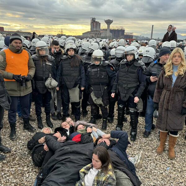 Okupljeni skandiraju "Hapsi". Pjevaju dok sjede ili stoje opkoljeni policijom.