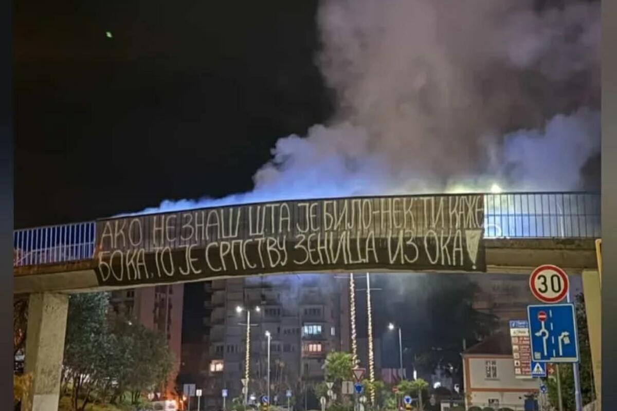 Transparent, na kojem piše "Ako ne znaš šta je bilo - nek’ ti kaže Boka, to je srpstvu zenica iz oka!" je, prema nezvaničnim saznanjima, postavljen u utorak veče prije ponoći