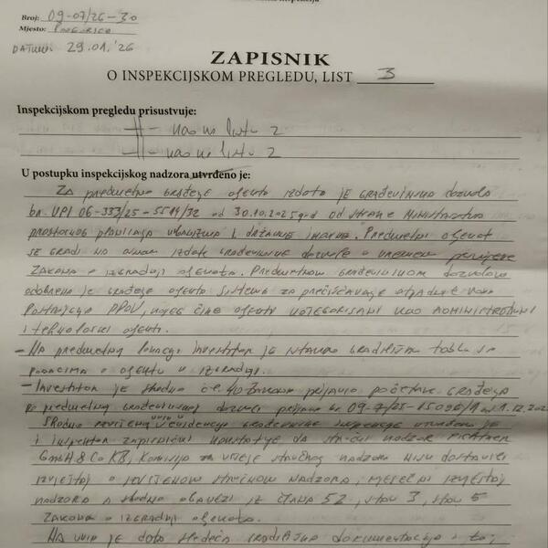 Prema nezvaničnim informacijama "Vijesti", taj inspektor nije ostavio rok za otklanjanje nepravilnosti već je odmah donio odluku o pečaćenju gradilišta.