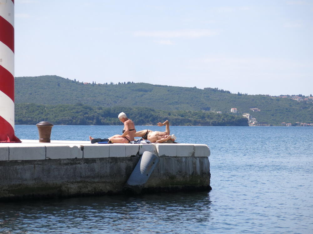 Uprkos tome što je po Uredbi o redu u lukama i marinama, kupanje i sunčanje u lukama zabranjeno, jedan stariji par turista već danima u kupaćim kostimima uživa u suncu i moru na sred gradske rive i pristaništa Pine u Tivtu.