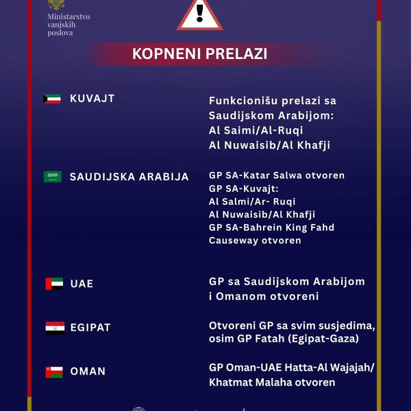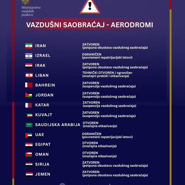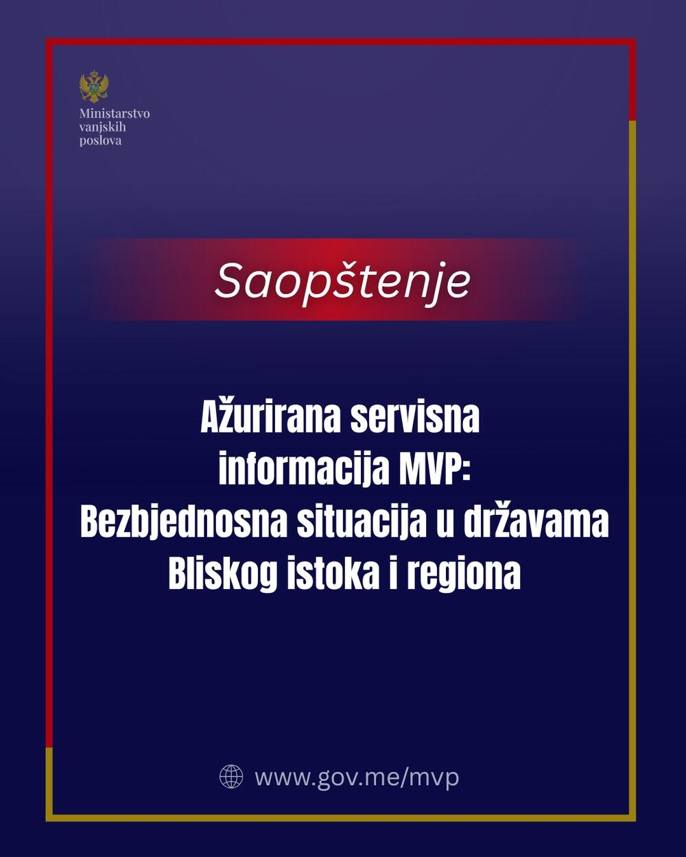 Ministarstvo vanjskih poslova saopštilo je da su, u cilju pravovremenog informisanja, ažurirali pregled ključnih servisnih informacija za države obuhvaćene bezbjednosnom eskalacijom, imajući u vidu povećan nivo bezbjednosnih rizika i poremećaje u međunarodnom saobraćaju.