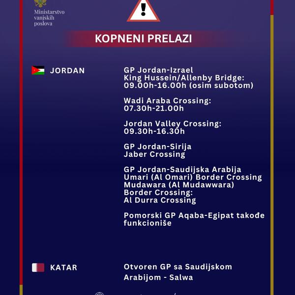 Medijima su dostavili vizuale sa ažuriranim servisnim informacijama, na kojima se nalazi spisak kopnenih prelaza i aerodroma u zemljama Bliskog istoka i regiona koji su otvoreni, a tu je i podsjećanje za posjetu kojim državama je potrebna viza.
