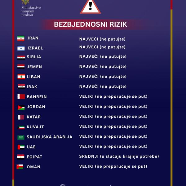 Takođe, MVP apeluje na crnogorske državljane da ne putuju u zemlje gdje je trenutno najveći bezbjednosni rizik - Iran, Izrael, Siriju, Jemen, Liban i Irak.