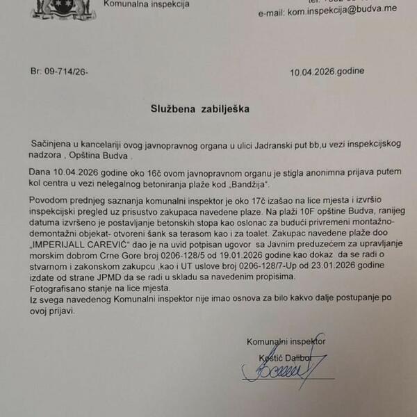 "Službena zabilješka sačinjena dana 10.04.2026 godine oko 16č ovom javnopravnom organu je stigla anonimna prijava putem kol centra u vezi nelegalnog betoniranja plaže kod 'Bandžija'. Komunalni inspektor je oko 17 časova izašao na lice mjesta i izvršio inspekcijski pregled uz prisustvo zakupaca navedene plaze. Na plaži 10F opštine Budva, ranijeg datuma izvršeno je postavljanje betonskih stopa kao oslonac za budući privremeni montažno - demontažni objekat - otvoreni šank sa terasom kao i za toalet.