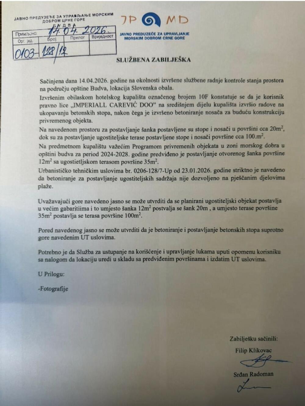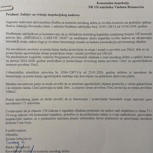 "Službena zabilješka sačinjena dana 14. aprila na okolnosti izvršene službene radnje kontrole stanja prostora na području opštine Budva, lokacija Slovenska obala.Izvršenim obilaskom hotelskog kupališta označenog brojem 10F konstatuje se da je korisnik pravno lice „IMPERIALL CAREVIĆ DOO" na središnjem dijelu kupališta izvršio radove na ukopavanju betonskih stopa, nakon čega je izvršeno betoniranje nosača za buduću konstrukciju privremenog objekta. Na navedenom prostoru za postavljanje šanka postavljene su stope i nosači u površini oko 20 kvadrata, dok su za postavljanje ugostiteljske terase postavljene stope i nosači površine oko100 kvadrata. Na predmetnom kupalištu važećim Programom privremenih objekata u zoni morskog dobra u opštini budva za period 2024-2028. godine predvideno je postavljanje otvorenog šanka površine 12 metara kvadratnih sa ugostietljskom terasom površine 35 kvadrata, urbanističko-tehničkim uslovima od 23. januara 2026. godine striktno je navedeno da betoniranje za postavljanje ugostiteljskih sadržaja nije dozvoljeno na pješčanim djelovima plaže", piše u službenoj zabiljšci.