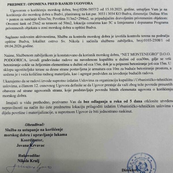 To piše u opomeni pred raskid ugovora, u koju su "Vijesti" imale uvid, a koju potpisuje direktor JP "Morsko dobro" Mladen Mikijelj.