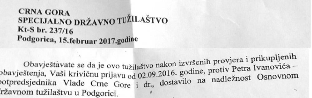 Osnovno državno tužilaštvo u Podgorici provjerava krivičnu prijavu glavne veterinarske inspektorke Mirjane Drašković protiv bivšeg potpredsjednika Vlade i ministra poljoprivrede Petra Ivanovića, u kojoj ga sumnjiči da nije preduzeo mjere za prevenciju zaraze kvrgave kože i plavog jezika.