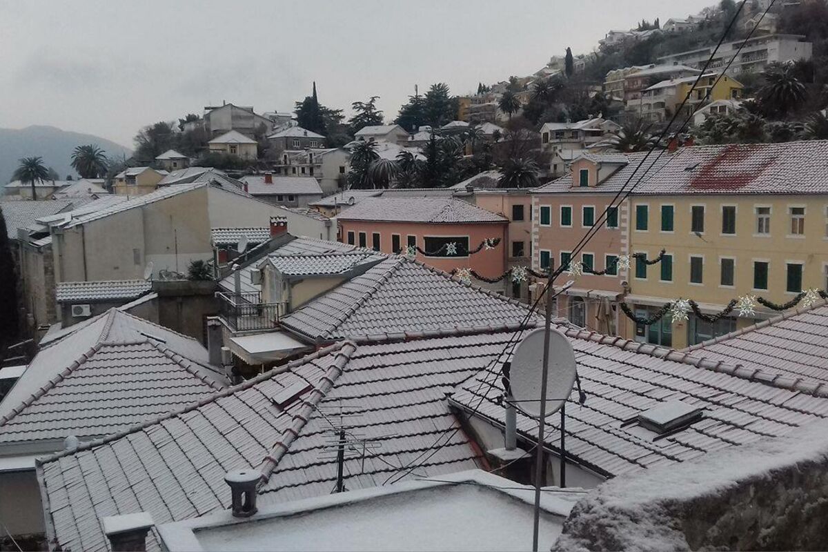 Jutros je hercegnovska rivijera osvanula pod snijegom. Snijeg je počeo da pada u 6 i 40 minuta i njegova visina je oko 5 centimetara. Temperatura je minus jedan stepene, tiho je bez vjetra.