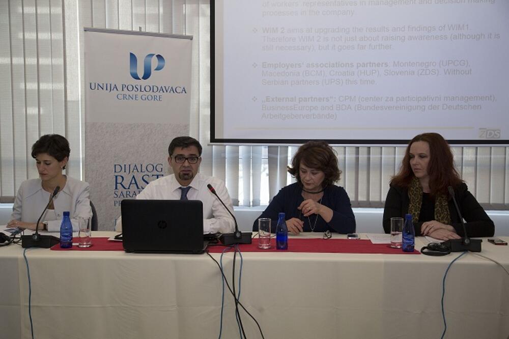 Predstavnik Udruženja poslodavaca iz Slovenije, Anže Hiršl, kazao je da su u okviru projekta sproveli istraživanje u kojem su učestvovale kompanije iz Crne Gore i Makedonije koje zapošljavaju od 20 do 50 zaposlenih. „Naša namjera je bila da u istraživanje uključimo od deset do 30 kompanija, u čemu smo uspjeli. Glavni cilj je bio da se ustanovi perspektiva poslodavaca o učešću zaposlenih u donošenje odluka“, rekao je Hiršl. On je naveo da je na prvo pitanje, kako poslodavci procjenjuju njihovo znanje uključenosti radnika u upravljanje i u proces donošenja odluka u kompaniji, menadžment odgovorio da imaju sve informacije koje su im potrebne o učešću zaposlenih u odlučivanju. „Glavni izazov je ovdje bio što se poslodavci zalažu za uspostavljanje radničkih savjeta, ali ne znaju kako će izgledati taj proces“, rekao je Hiršl. On je kazao da su na drugo pitanje, koje se ticalo svrhe učešća radnika u menadžmentu, poslodavci odgvorili da ako radnici uspostave radničke savjete, odluke će automatski biti mnogo bolje. „Činjenica je da uključivanje zaposlenih u proces donošenja odluka može dovesti do veće transparentnosti i obezbijediti legitimnost donošenja odluka. Ako ne uzimate u obzir interese zaposlenih na bilo koji način, onda vaše odluke neće biti bolje“, precizirao je Hiršl. Naredno pitanje se, kako je naveo, odnosilo na odgovornost zaposlenih u donošenju odluka. „Poslodavci su slali nejasne odgovore. Razumijevanje poslodavaca je takvo da po njima radnički savjeti treba da rade samo u prilog kompanijama, što ne mora nužno biti tačno“, rekao je Hiršl. On je kazao da je na pitanje da li se u obzir uzimaju samo interesi zaposlenih ili i kompanije, odgovor bio ako se uzme u razmatranje interes zaposlenih, kompanija će takođe imati koristi od takvih odluka. Predstavnik Međunarodne organizacije poslodavaca, Alessandra Assenza, saopštila je da radnički savjet omogućava međusobno razumijevanje strana, zajednički se razgovara o problemima, jer ponekad, kako je navela, radnici ne znaju koji su problemi koje kompanije imaju. „Sa druge strane, poslodavci ne znaju šta su potrebe zaposlenih. Takođe se omogućava bolja vizija tržišnih uslova i konkurentnosti na tom tržištu. Prilikom donošenja odluka sa dvije strane, te strane se osjećaju povezanim i omogućava se kompaniji da se bolje prilagođava izazovima“, rekla je Assenza.