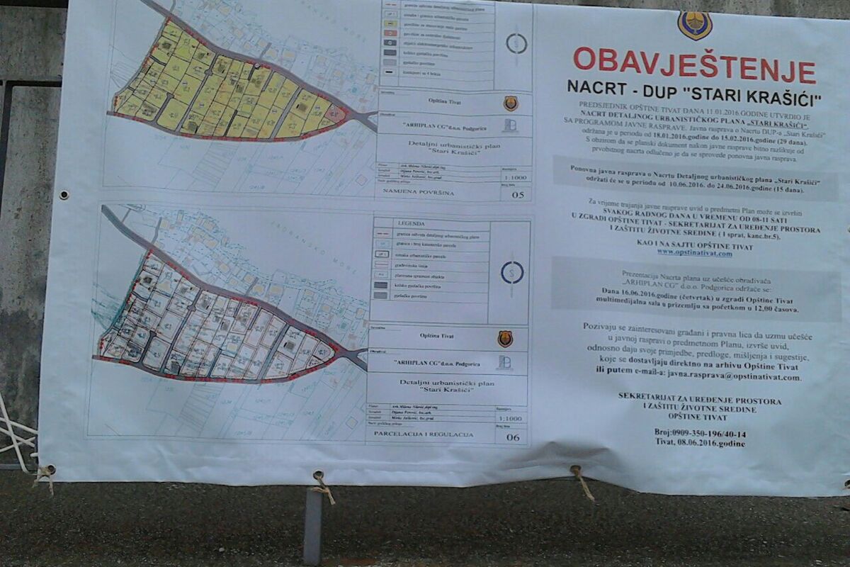 Prvo plastificirano platno dimenzija 1.00 m x 1.50 m sa grafičkim prikazom planske dokumentacije i obavještenjem o sprovođenju javne rasprave, po prvi put je postavljeno na objektu Mjesne zajednice Krašići za potrebe DUP-a “Stari Krašići.”