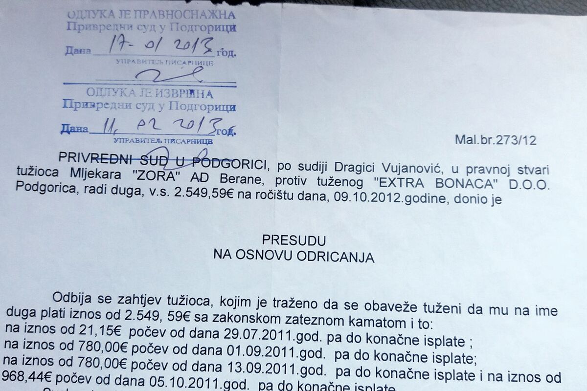 „Kako smo u prigovoru na rješenje o izvršenju javnog izvršitelja kao dokaz dostavili pravosnažnu presudu kojom smo oslobođeni od duga od 2.549 eura, pa je time jasno i nedvosmisleno naša obaveza po Zakonu o izvršenju i obezbjeđenju član 58 izvršena, a ostali dio duga od 5.437,20 eura prema našem dobavljaču Zora Berane uredno plaćen u cjelini. Zato smatramo da je donošenje rješenja IP.br.814/14 Privrednog suda bilo apsulutno protivzakonito jer nije postojao nijedan osnov po kojem smo mogli biti dužni osim po istim fakturama i istom iznosu koji je već jednom pravosnažno presuđen“, naveo je Ivanović u odgovoru Privrednom sudu.