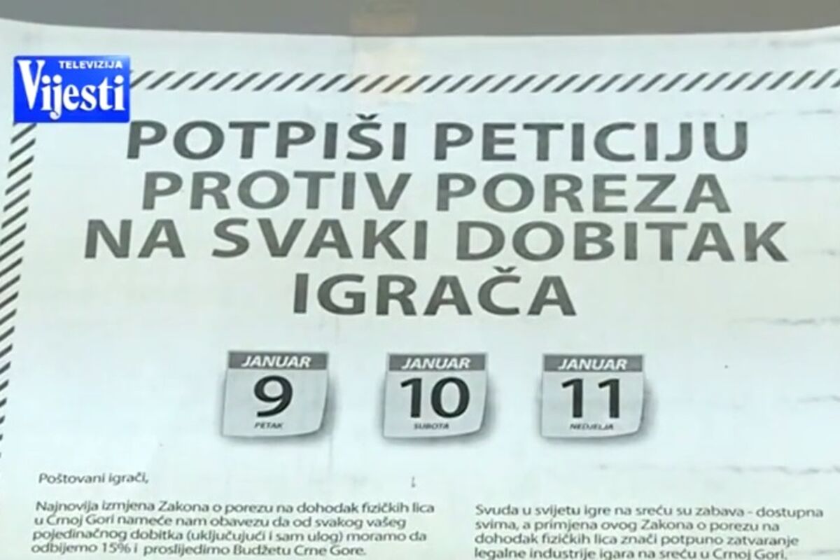 Udruženje priređivača igara na sreću Montenegro bet je pokrenulo peticiju protiv izmjena Zakona o porezu na dohodak fizičkih lica prema kojima se sa 15 odsto oporezuje dobitak igrača.