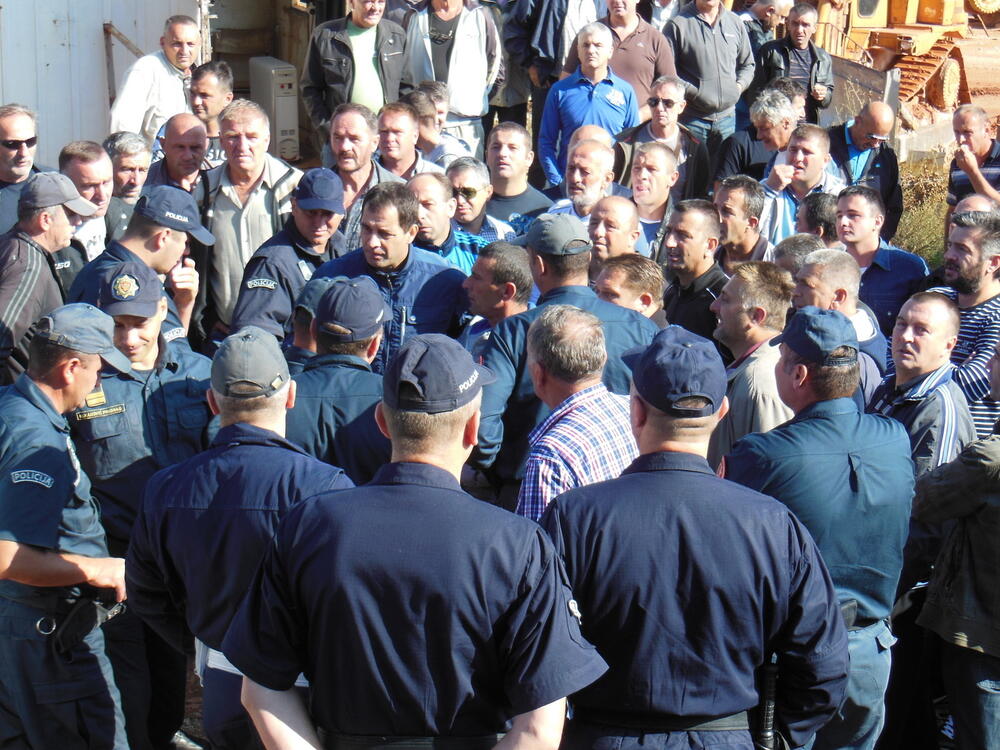 U toku je svađa radnika i policije, jer radnici pokušavaju da probiju blokadu koju je policija postavila i krenu na protest u Podgoricu.