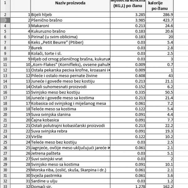 Viršli ima 122 grama za mjesec po osobi ili skoro četiri grama dnevno. Svježe pastrmke za cijeli mjesec predviđeno je 61 gram, a sardine u ulju 30 grama ili gram dnevno. To znači da bi jednu konzervu od 100 grama sardine mjesečno podijelila tri člana domaćinstva.