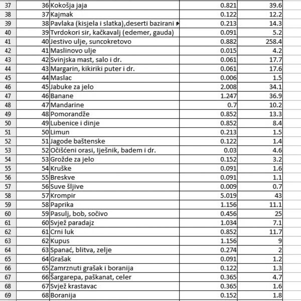 Krompira u korpi ima pet kilograma za mjesec, a paprika ili svježeg paradajza po oko kilogram. Šećera ima jedan kilogram, a namaza poput eurokrema 122 grama za mjesec dana ili skoro četiri grama dnevno.