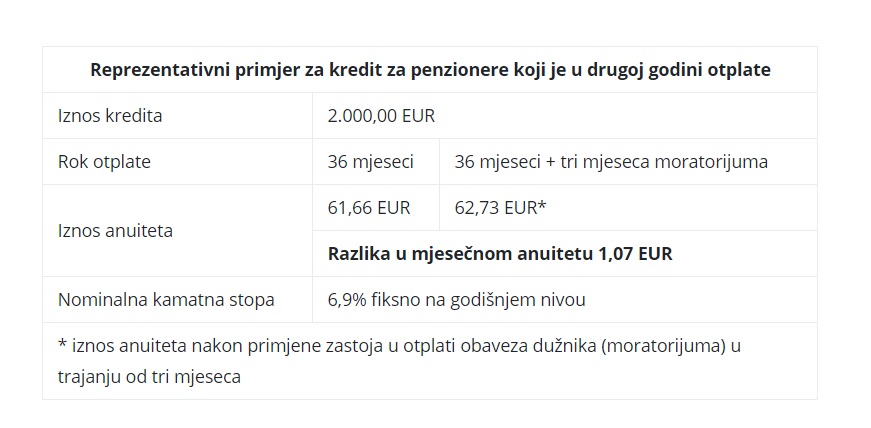 Moratorijum na otplatu kredita obuhvata privremenu obustavu svih plaćanja obaveza po osnovu kredita (glavnice, kamate, zatezne kamate i dr.) tokom trajanja moratorijuma. Navedeno podrazumijeva da korisnik kredita neće plaćati anuitete (glavnicu i kamatu) tokom perioda trajanja moratorijuma, a čija visina je definisana planom otplate, koji čini sastavni dio ugovora o kreditu. U skladu sa navedenim, ukoliko korisnik kredita aktivira moratorijum na period od 90 dana, a u tom vremenskom periodu mu, u skladu sa planom otplate, dospijevaju tri anuiteta u ukupnom iznosu od 900 eura (3 anuiteta po 300 eura), navedeni iznos sredstava neće biti naplaćen od strane banke tokom trajanja moratorijuma, već će uticati na povećanje raspoloživog dohotka korisnika kredita.