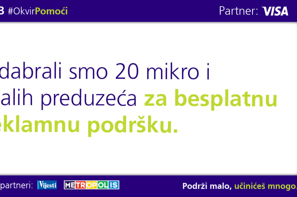 Nakon uspješnog konkursa i zahtjevnog procesa selekcije, NLB Banka je odabrala 20 preduzeća kojima će pokloniti prostor za oglašavanje kroz projekat #OkvirPomoći, u saradnji sa kompanijom Visa i medijskim partnerima, kompanijama Vijesti i Metropolis Media.