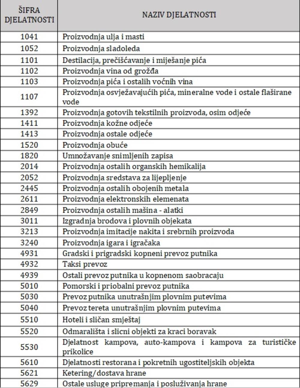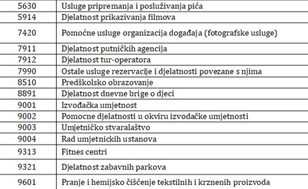 Među ugroženim djelatnostima obuhvaćene su i: predškolsko obrazovanje, djelatnost dnevne brige o djeci, izvođačke umjetnosti, umjetniško stvaralaštvo, rad umjetničkih ustanova, fitnes centri, djelatnost zabavnih parkova, djelatnost putničkih agencija, hotel i sličan smještaj...