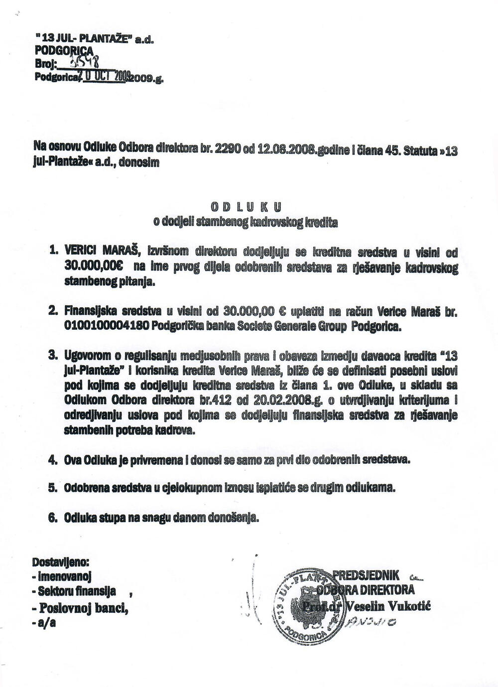 Stambeni krediti su uglavnom dijeljeni bespovratno, odnosno Odlukom o dodjeli kredita za rješavanje stambenih potreba, a dobio ih je skoro kompletan rukovodeći kadar u iznosima od 30.000 do 299.000 eura.