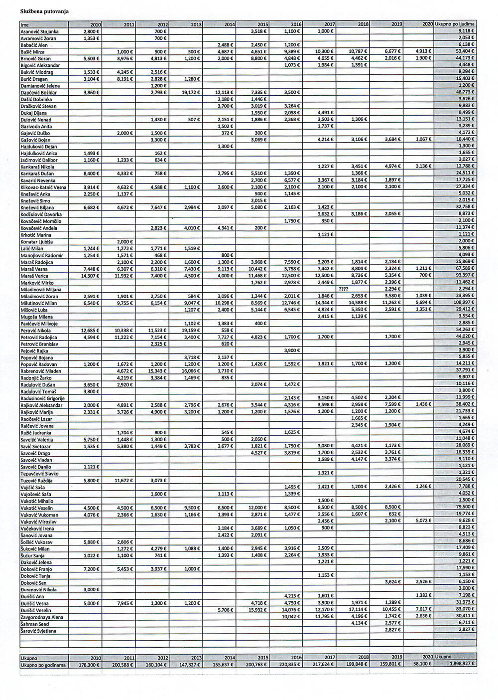 Tako je, kako je navedeno, Milanu Milutinoviću za službena putovanja od 2010.do 2020. godine isplaćen iznos od 108.997 eura, Verici Maraš iznos od 93.397 eura, Veselinu Đurišiću 83.070 eura,...