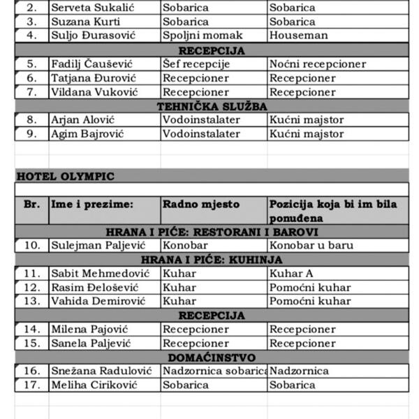 Sastavni dio ugovora potpisanog sa Vladom je spisak radnika koje će pruzeti. U njemu su imena devet radnika hotela Belvi i 12 radnika Olimpika.